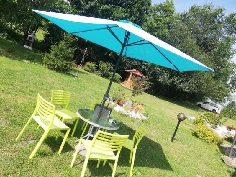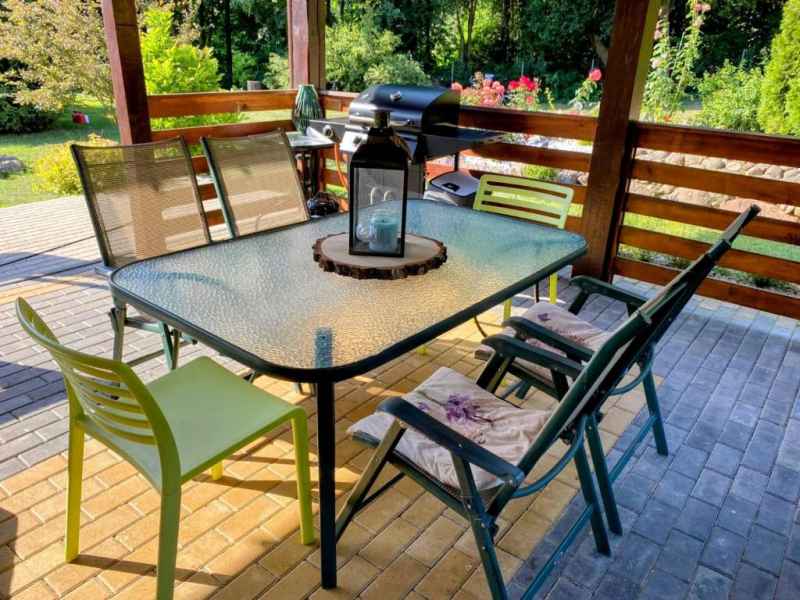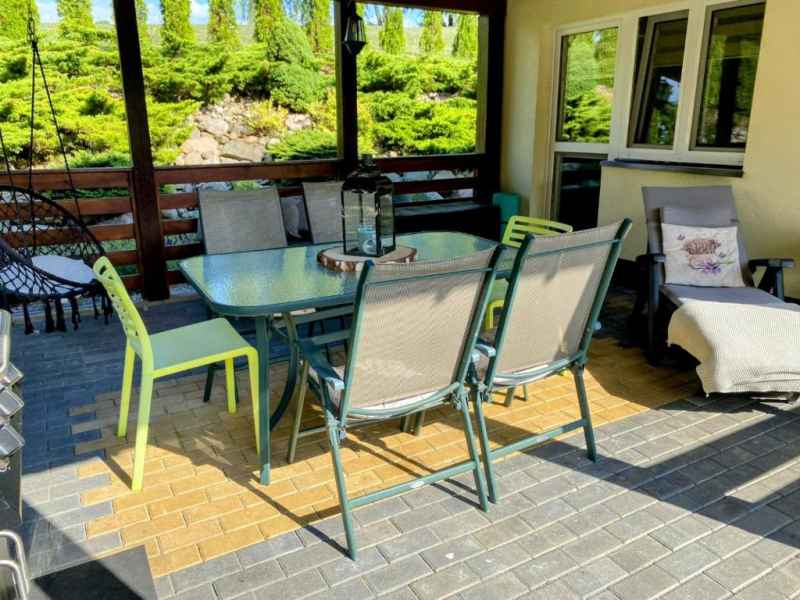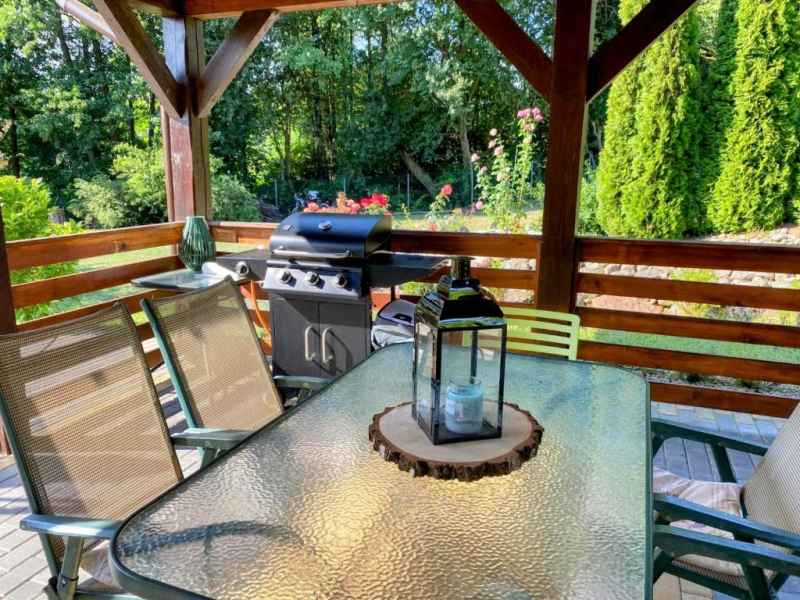 Z salonu wyjście na zadaszony taras wyposażony w stół, krzesła i leżankę. W tym miejscu spędzicie Państwo miło czas grillując przy użyciu grilla gazowego.