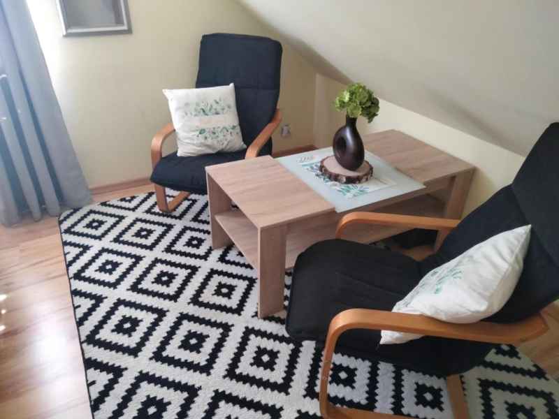 W salonie sofa 2 osobowa, stół z 4 krzesłami, tv 32", komoda.
