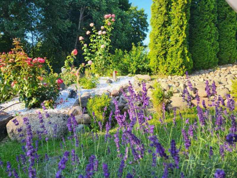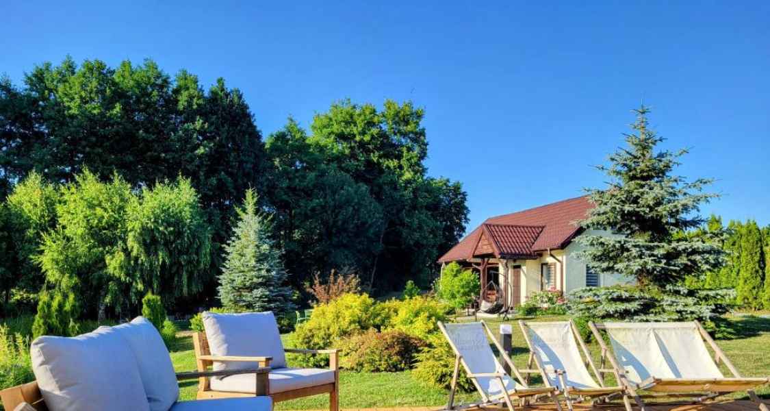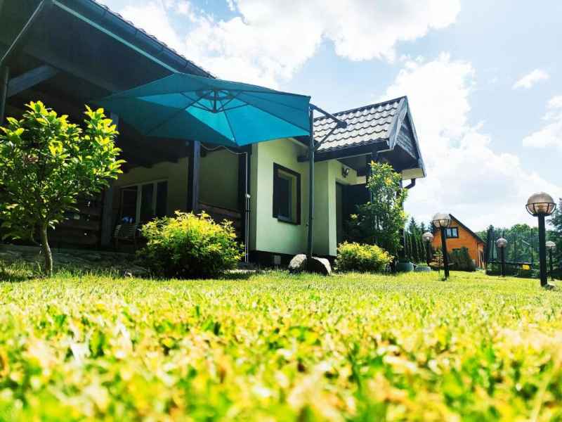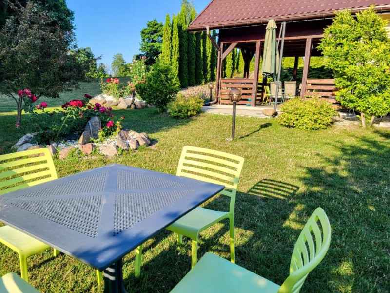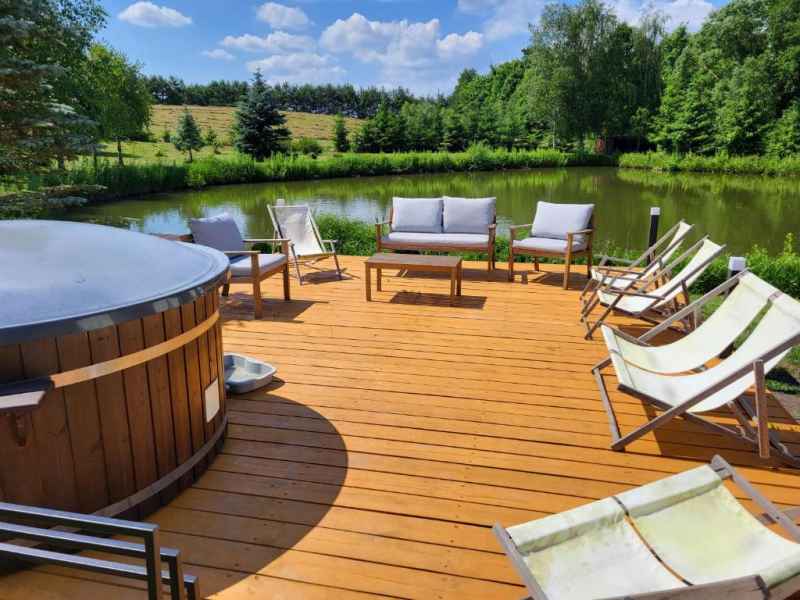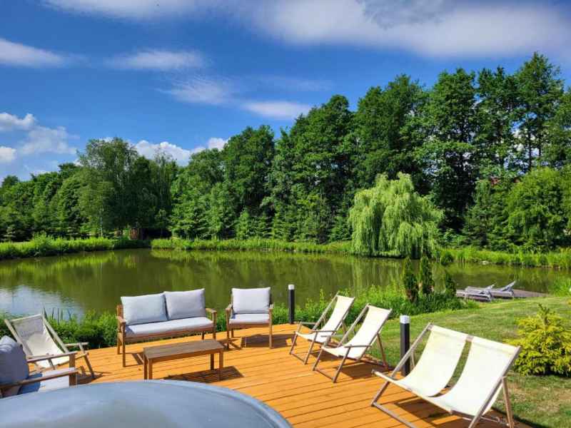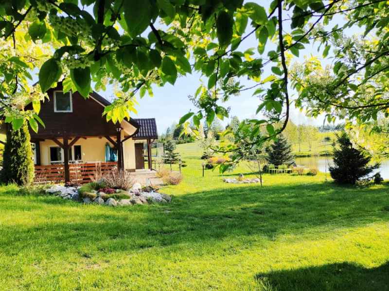 Działka na którym stoi domek jest dużym zielonym terenem ze stawem oraz miejscem na ognisko i grilla.