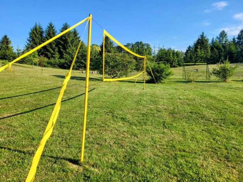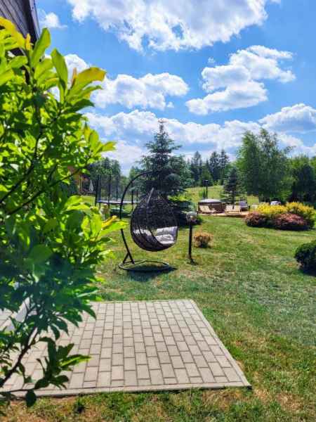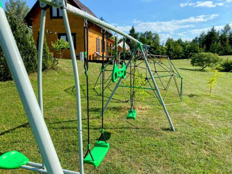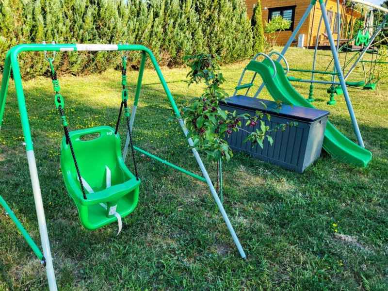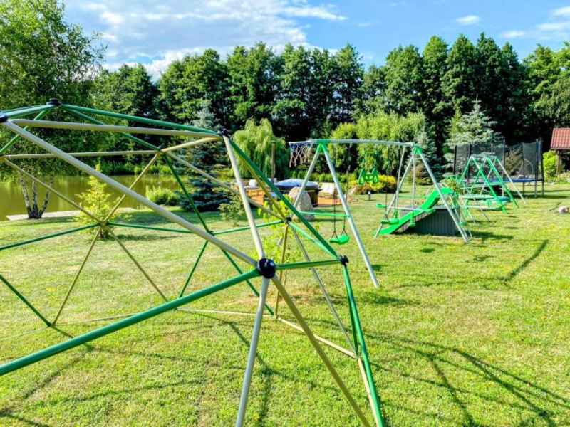 Do dyspozycji dzieci: trampolina, plac zabaw z huśtawkami i piaskownicą oraz boisko do gry w siatkówkę i piłkę nożną.