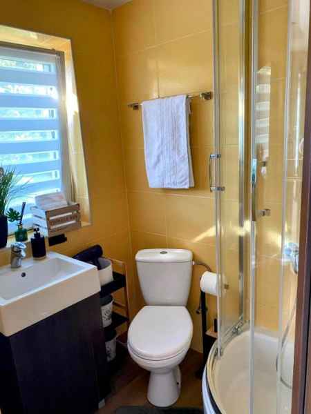 Łazienka wyposażona w kabinę prysznicową, wc oraz szafkę z umywalką.